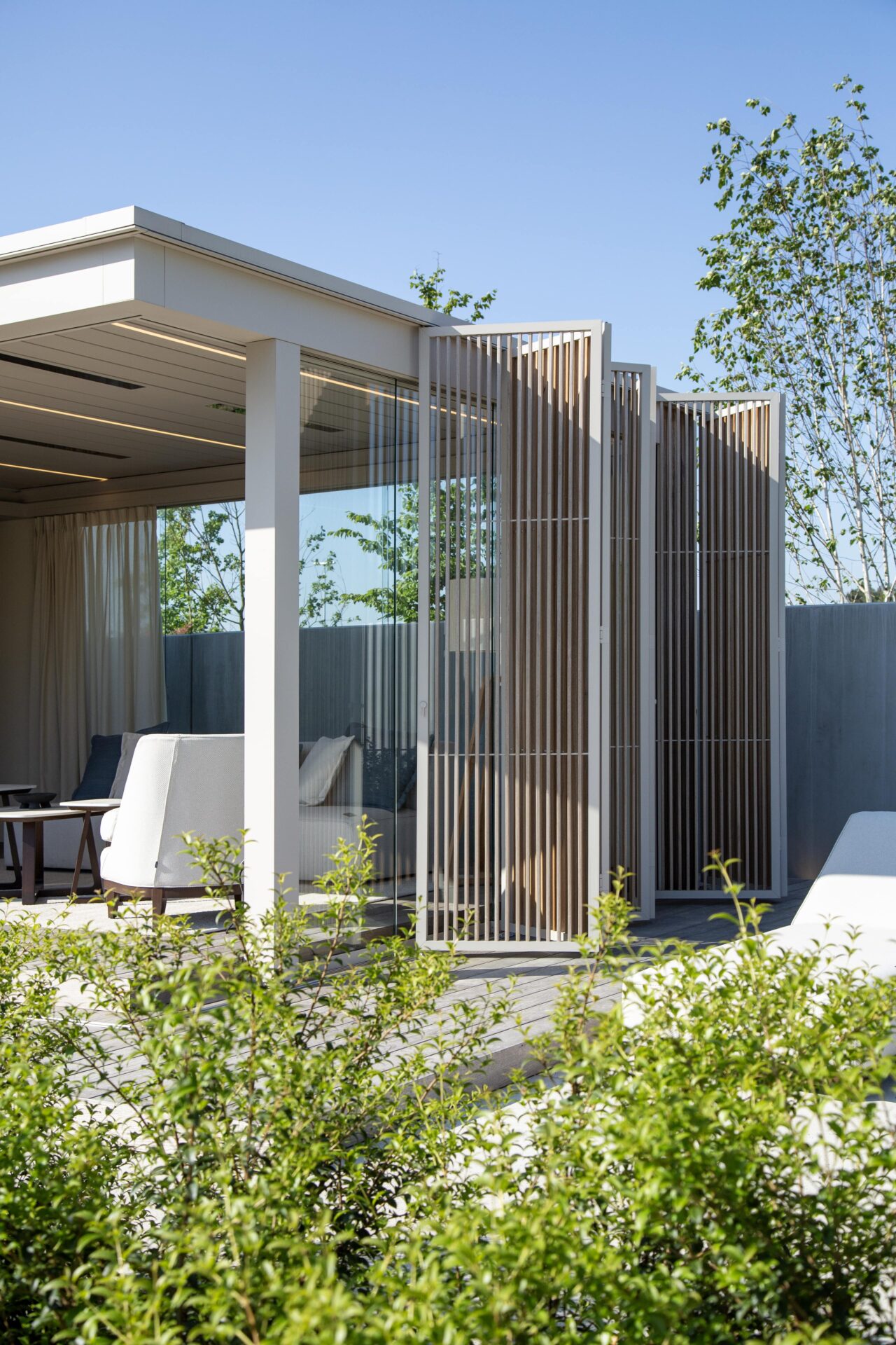 De Renson Amani is niet zomaar een overkapping — het is een totaalervaring. Geniet van ingebouwde verwarming voor perfecte temperaturen, richtbare verlichtingsarmaturen die sfeer en functionaliteit combineren, en schuifbare designpanelen die zich aanpassen aan elk moment van de dag. De harmonicawanden en glaspanelen vervagen de grens tussen binnen en buiten, terwijl akoestische wandpanelen en buitengordijnen zorgen voor ultieme rust en privacy.