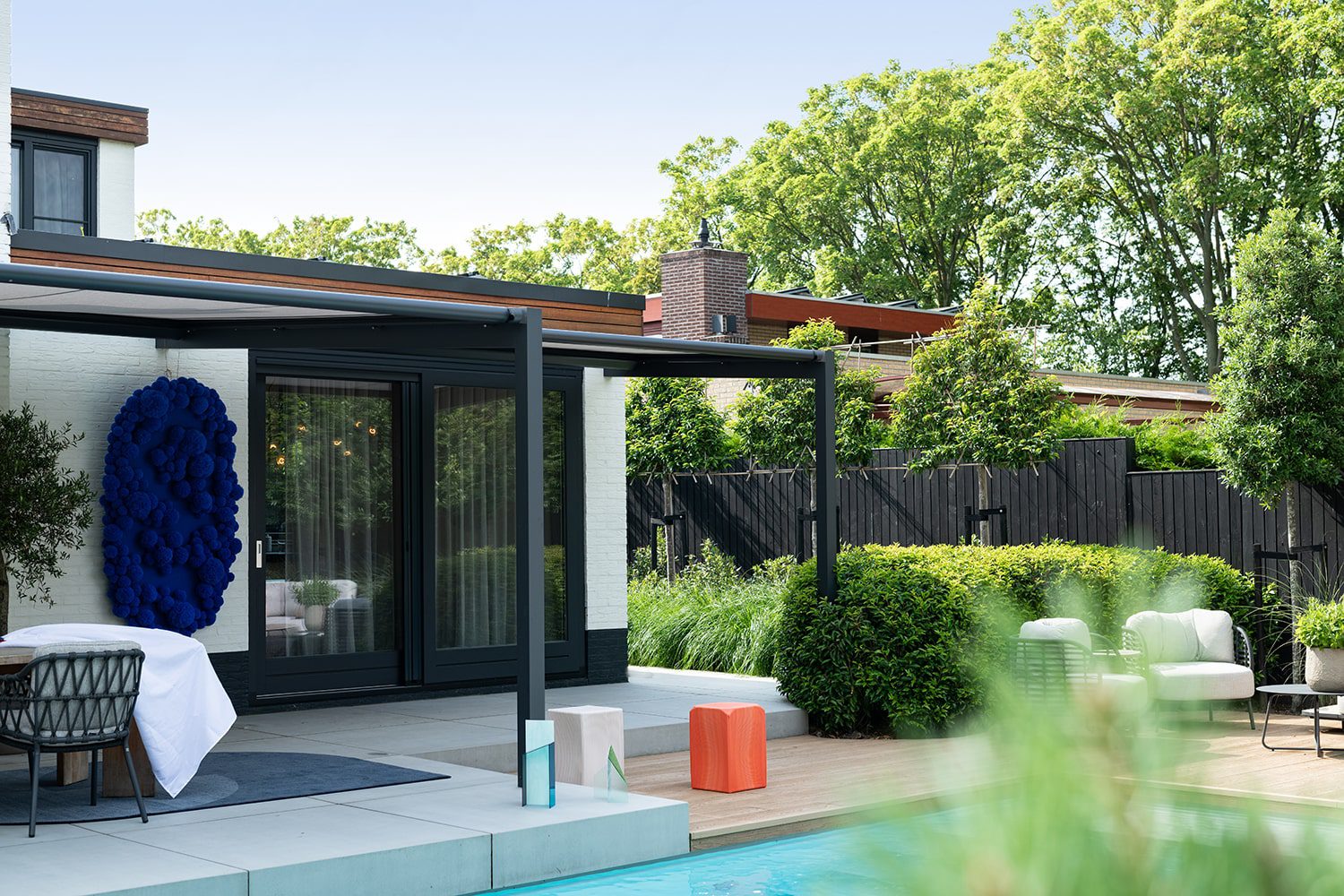 De groene oase in de stadse omgeving Rhoon is een verrassende tegenstelling. Deze zonnige tuin leent zich uitstekend voor de aangelegde welness. Een schaduwplek is gewenst, maar wel op z’n tijd. Dat vraagstuk sluit precies aan bij doekoverkapping Luc. Eén druk op de knop en het is geen overkapping meer, maar een plaats voor zonaanbidders. Wilt u de zonwering in- of uitrollen? Dat doet u geruisloos. De zonwering loopt met gelagerde wieltjes door de rails in de constructie. Deze aluminium doekoverkapping is 2-delig. Het verschil is dat de doeken een andere uitvallengte hebben waardoor je op elke gewenste situatie kan inspelen.