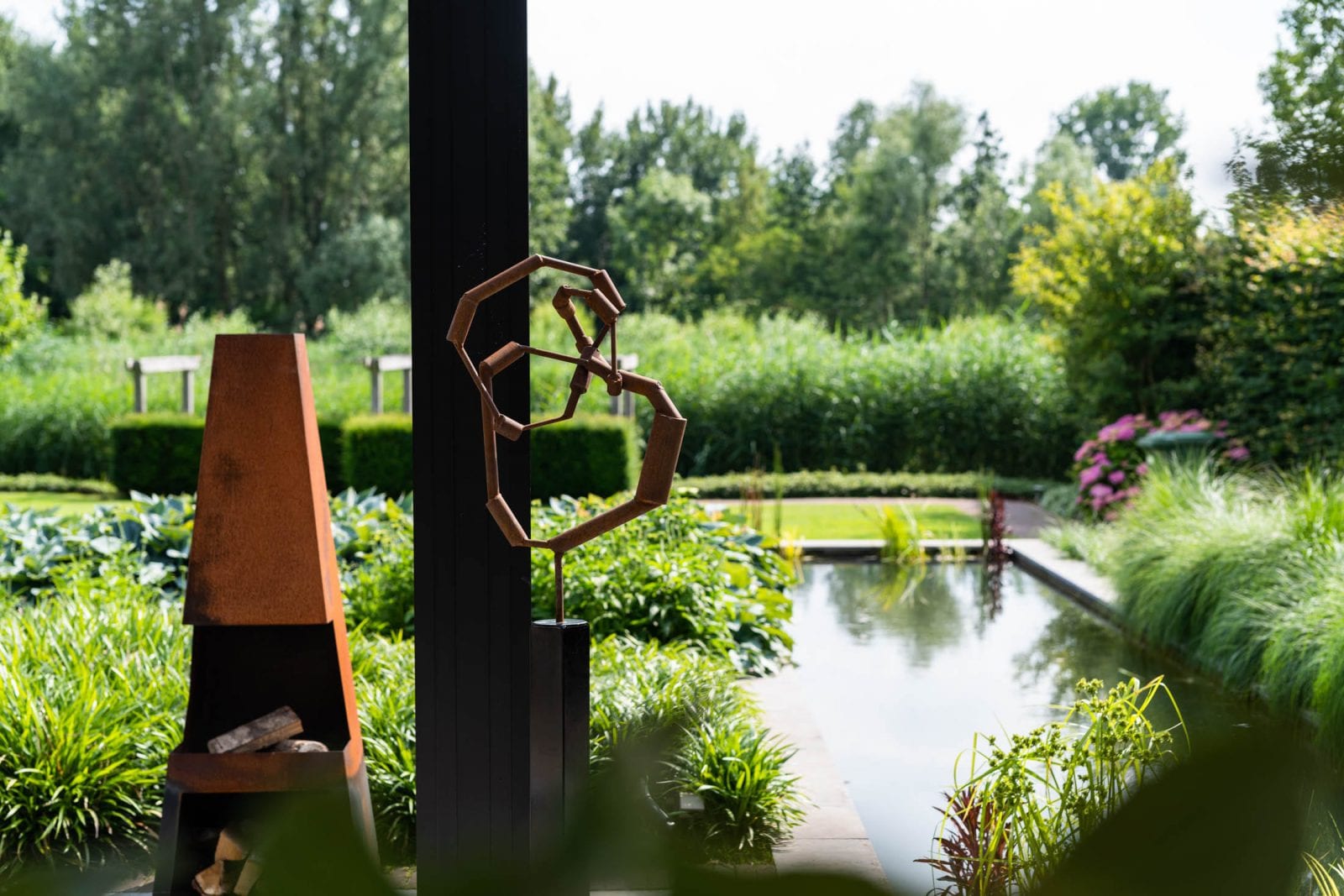 Onder onze klanten bevinden zich veel kunstliefhebbers. Kunst is identiteit en geeft huis en tuin een persoonlijk karakter. Zo ook in dit project. De moderne tuinkamer vormt een contrast met de unieke sculptuur. De ruwe materialen van de sculptuur zijn daardoor een ultieme combinatie met de matte, zwarte tuinkamer. En door het unieke comfort van de tuinkamer kan er niet alleen ’s zomers genoten worden. Het hele jaar door kan er, dag in dag uit, genoten worden van tuin, terras en kunst.